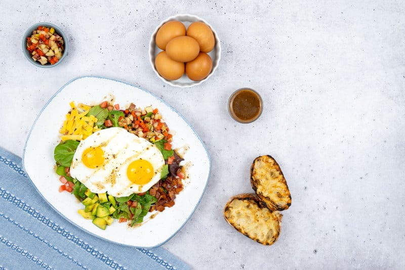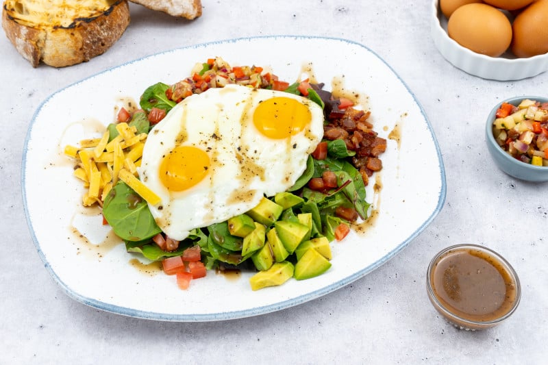 Two fried eggs (or customer choice of style), crispy bacon (or sausage) and roasted potatoes served on a bed of fresh mixed greens and spinach with mashed avocado, diced tomatoes, and shredded cheddar cheese, then drizzled with a choice of our Litehouse® Balsamic, Litehouse® Honey Mustard or chipotle ranch.