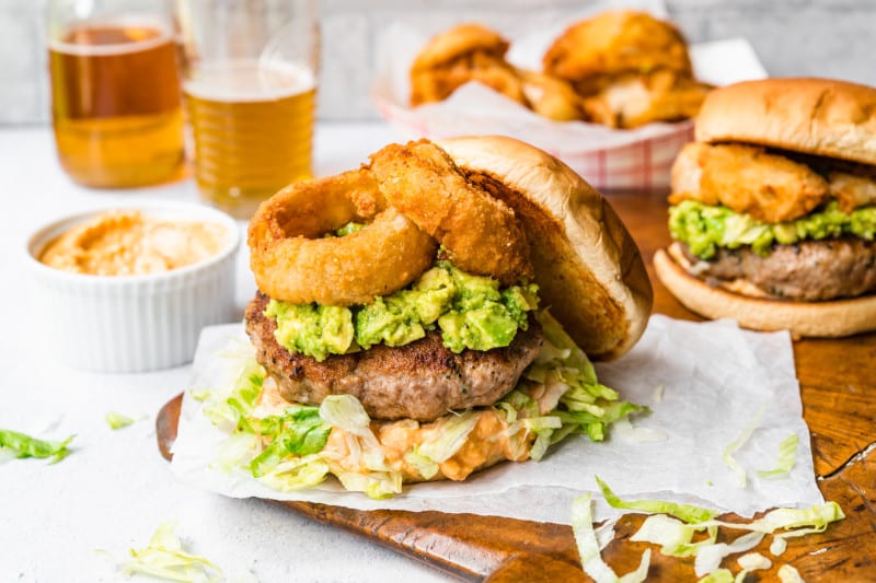 A fresh and flavorful avocado burger – a well-seasoned turkey patty served on a toasted potato bun with chipotle mayonnaise, cojita cheese, iceberg lettuce, and mashed avocado spread, layered with fresh onion rings.