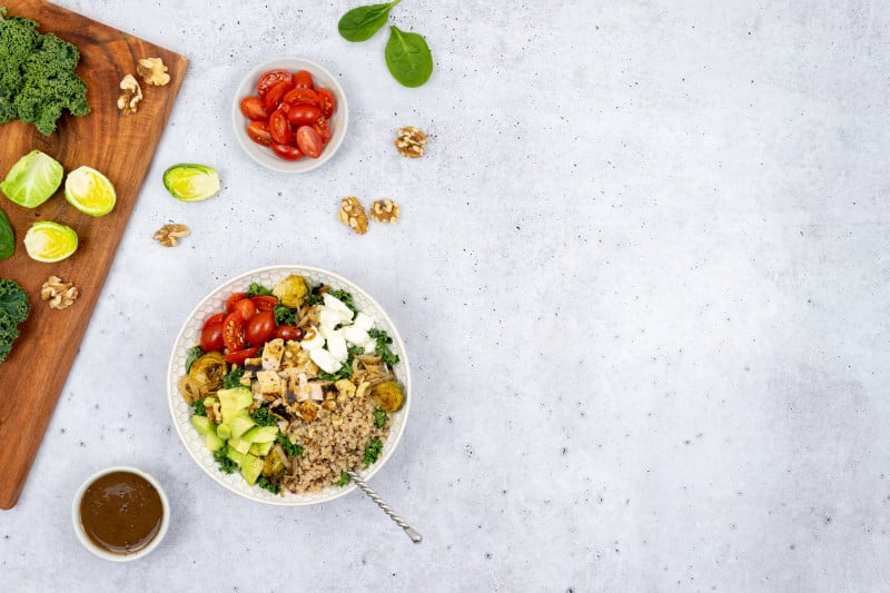Nutrient and protein packed “power” bowl prepared with marinated chicken breast, brussel sprouts roasted in rosemary balsamic dressing, grape tomatoes, crumbled feta, tri-colored quinoa, avocado (diced or sliced), and chopped walnuts on a bed of spinach and shredded kale. Served with a choice of our Litehouse® Red Wine Olive Oil or Litehouse® Balsamic dressing.