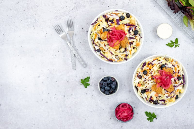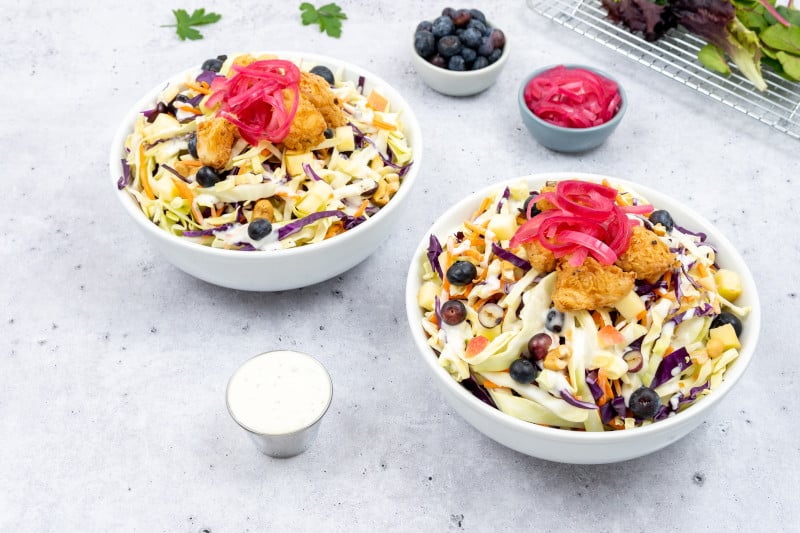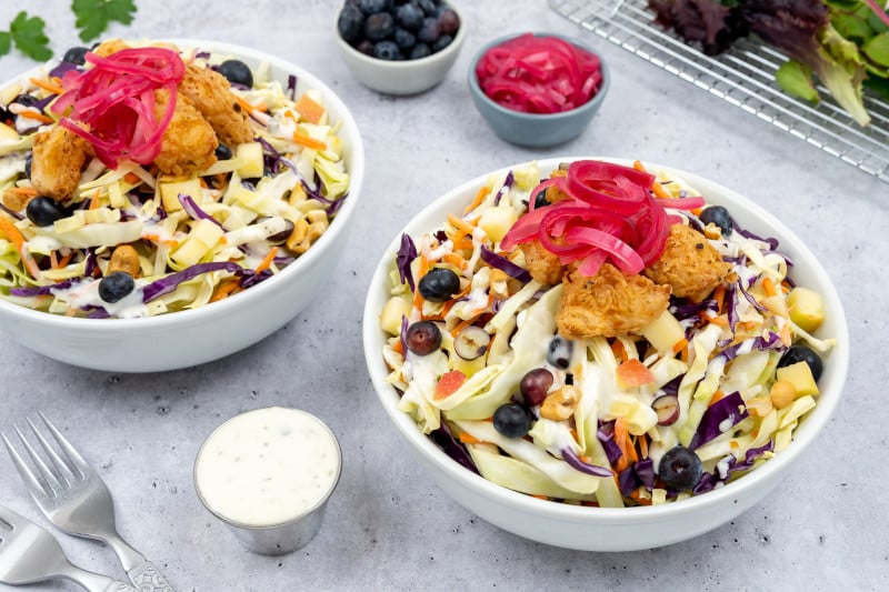 Chicken breast (or thigh) double breaded and fried. Served on a bed of shredded romaine lettuce and coleslaw blend, with sliced apples, blueberries, pickled red onion and roasted cashews. Tossed with a choice of our Litehouse® Country Buttermilk Ranch, Litehouse® Sesame Ginger or Litehouse® Honey Mustard.