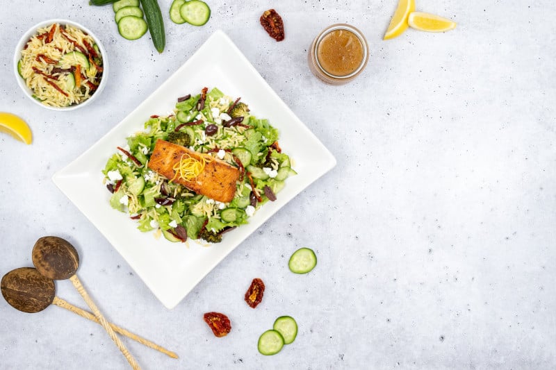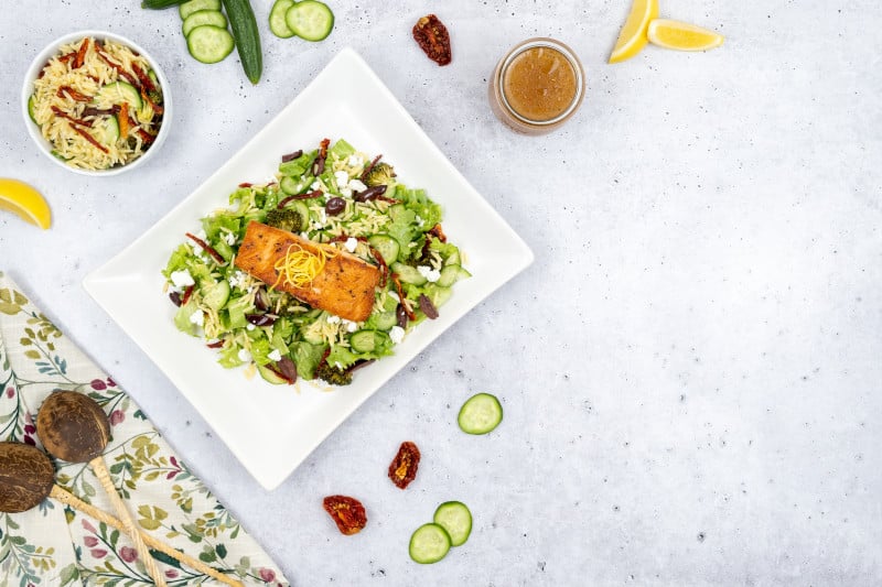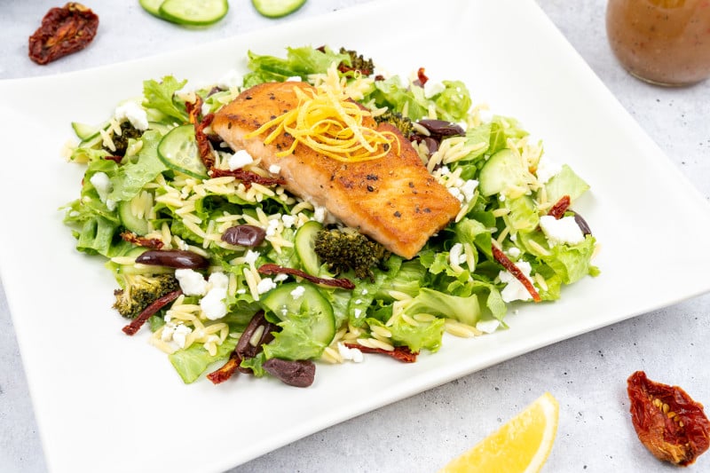 Seasoned filet of salmon (grilled or sautéed) and placed on fresh shredded romaine lettuce with sundried tomatoes, broccoli florets, kalamata olives, feta cheese, French cucumber and orzo. Prepared with Litehouse® Romano Caesar dressing.
