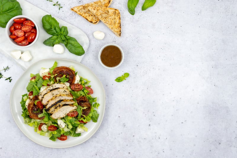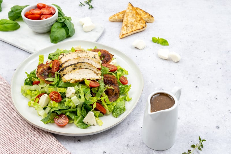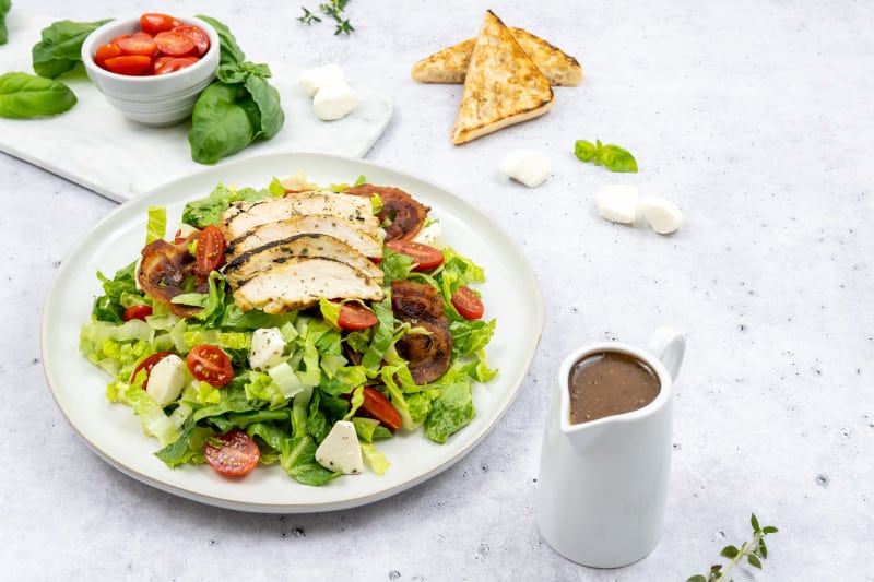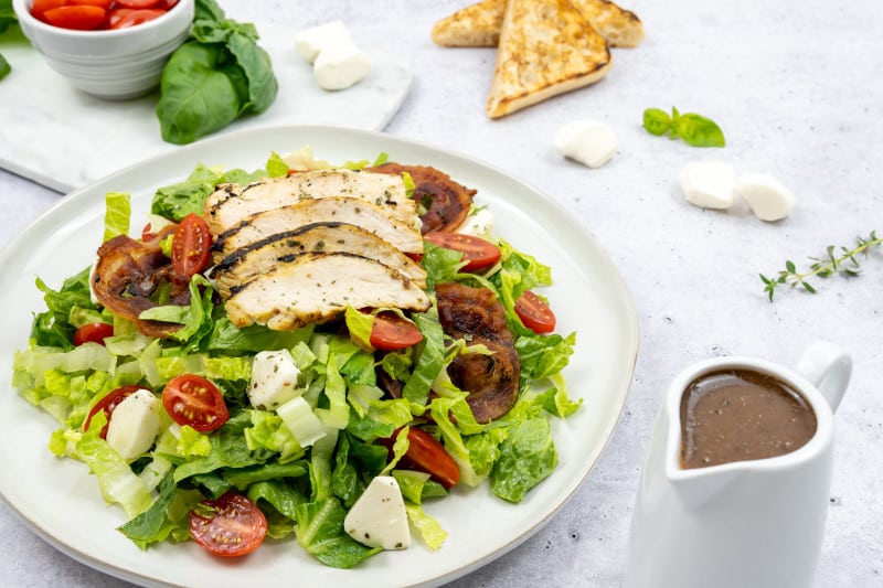 A spin on an Italian classic - grilled chicken breast marinated in Litehouse® Lite Honey Dijon and served on a bed of romaine and Litehouse® Freeze Dried Basil. Topped with crispy panceta, fresh mozzarella, dried cranberries, grape tomatoes and a slice of grilled ciabatta bread. Enjoyed with our Litehouse® Balsamic, Litehouse® Romano Caesar, or Litehouse® Italian dressing.