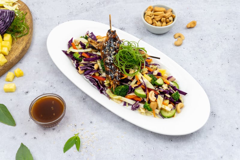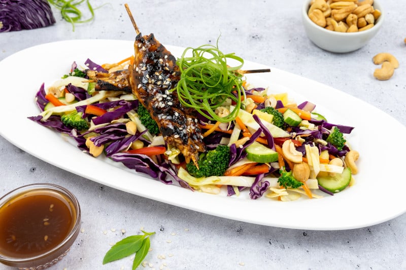 Chicken tenderloins marinated overnight in Litehouse Sesame Soy Ginger® sauce, grilled to order and served on a mix of shredded iceberg and coleslaw blend with diced pineapple, broccoli, cucumber, red pepper. Topped with green onion, cashews and sesame seeds. Drizzled with our Litehouse® Sesame Ginger.